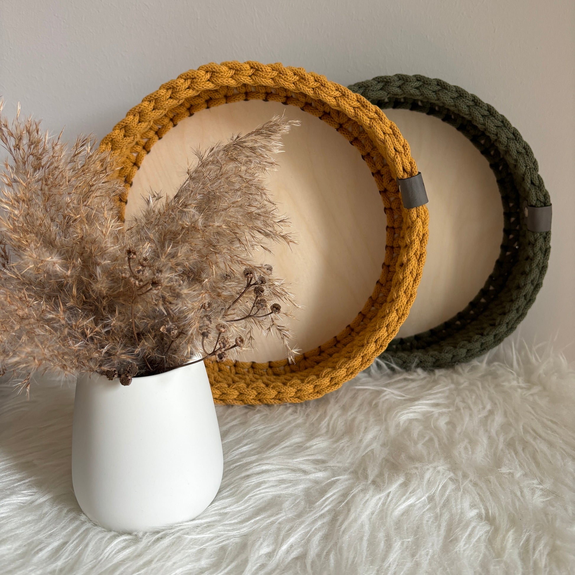 Bringe gemütliche Eleganz in dein Zuhause mit diesem liebevoll handgefertigten Dekotablett. Der stabile Holzboden und der wunderschöne Häkelrand aus 100 % recycelter Baumwolle vereinen Nachhaltigkeit mit zeitlosem Design.