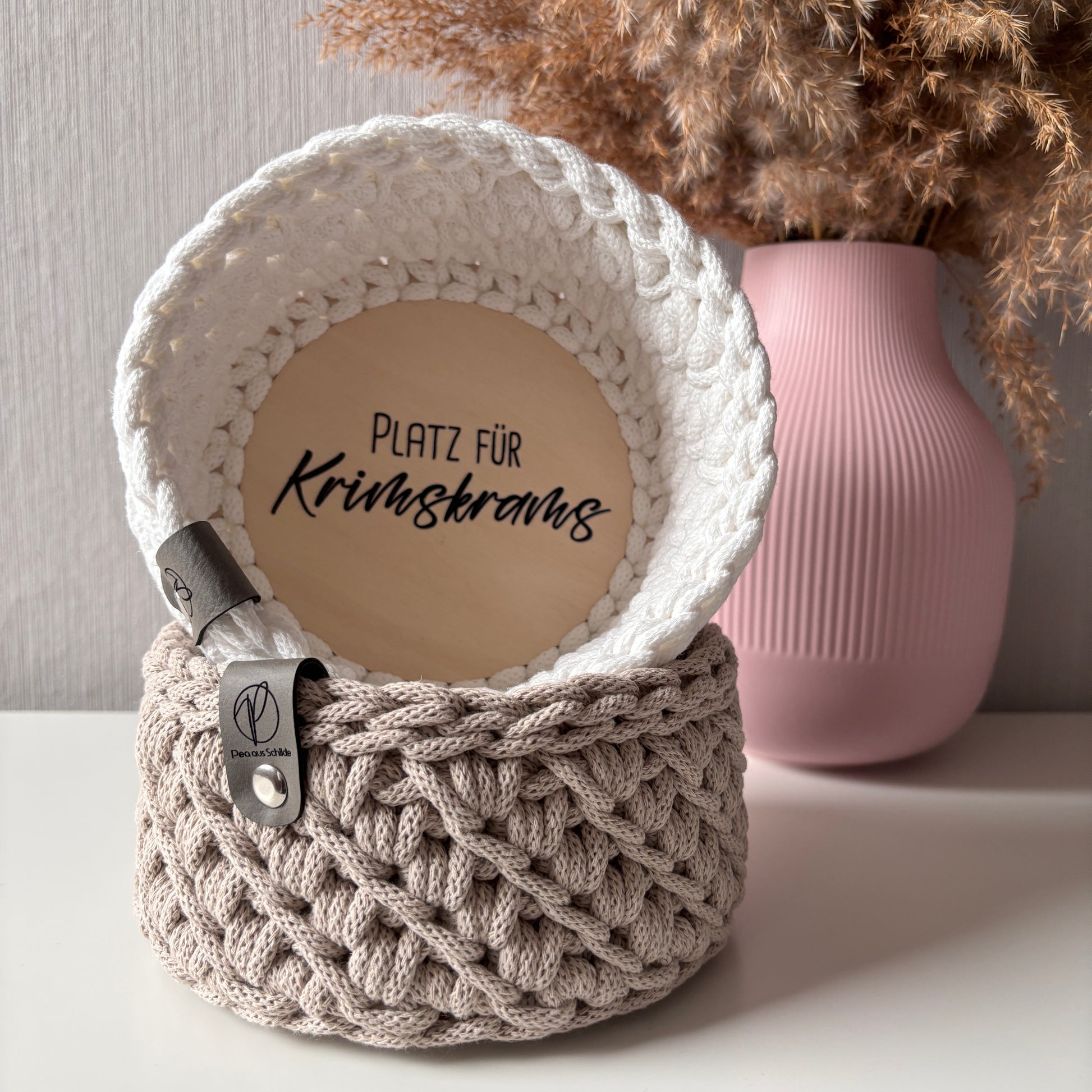 Unser handgehäkelter Korb mit Holzboden und der Gravur „Platz für Krimskrams“ bringt Ordnung und Charme in dein Zuhause. Ob Haarspangen, Ladegeräte, Schmuck oder andere kleine Schätze – hier bekommt alles seinen festen Platz.