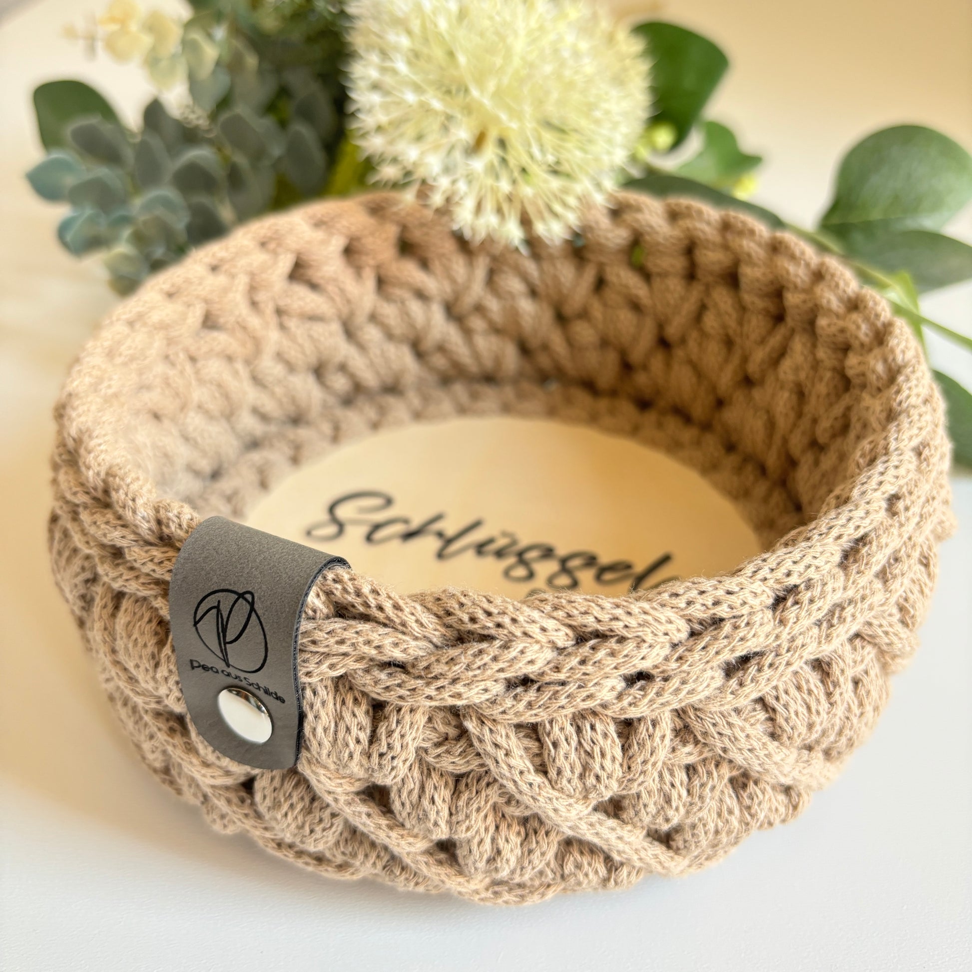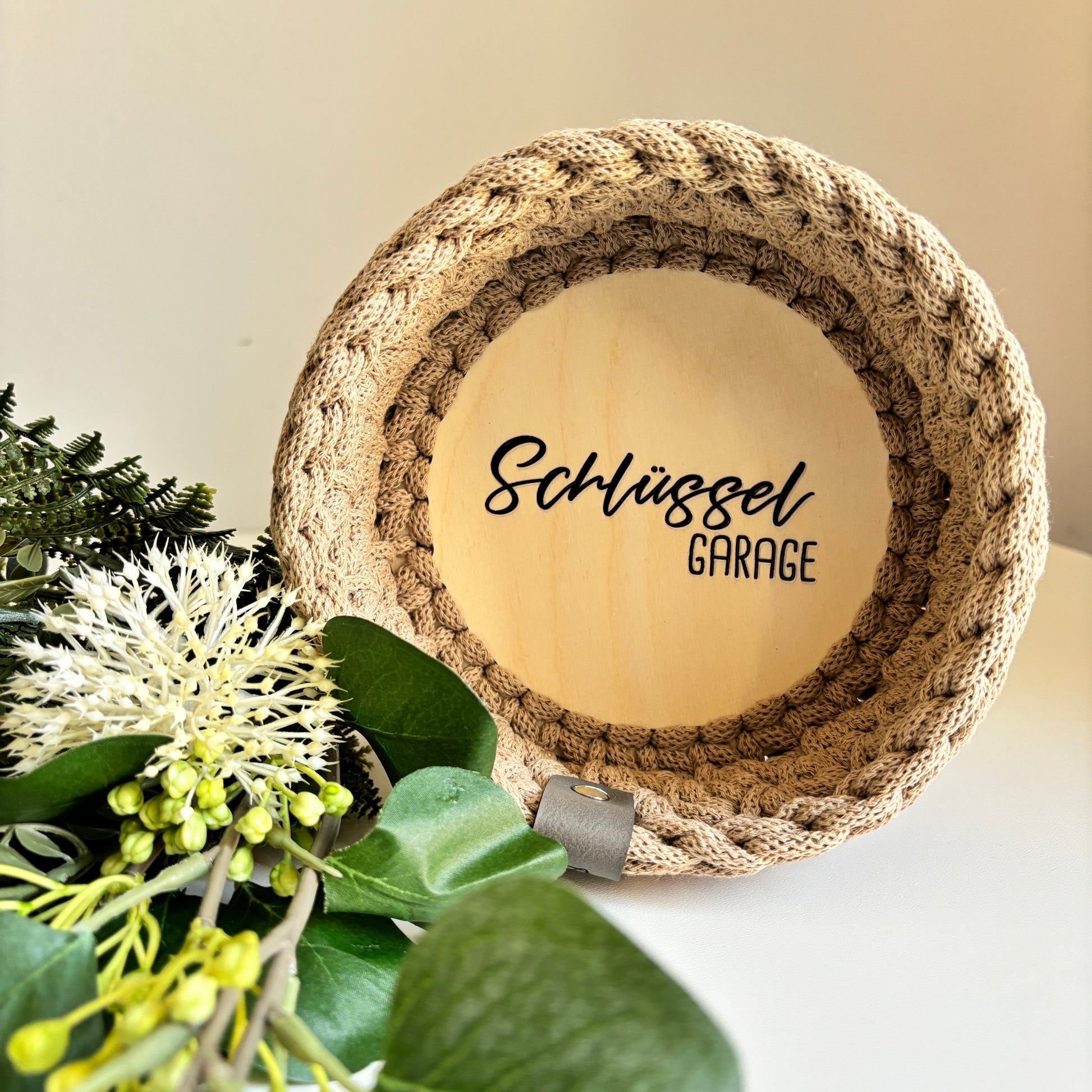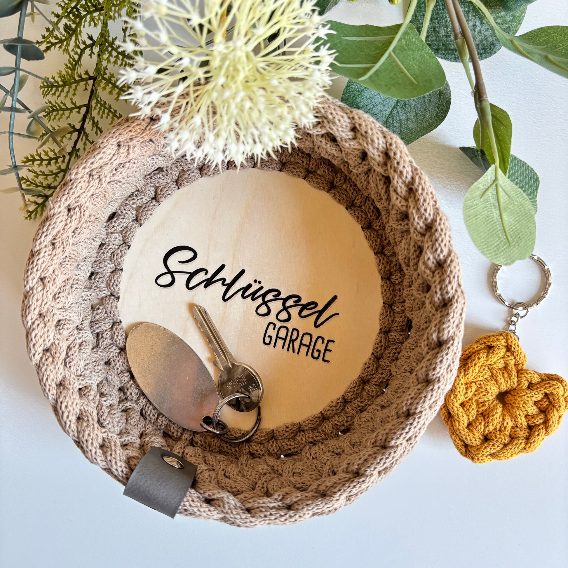 Unser handgehäkelter Korb mit Holzboden und der Gravur „Schlüsselgarage“ ist der perfekte Platz für alles, was du sonst ständig suchst. Ob Haustürschlüssel, Autoschlüssel oder kleine Alltagsbegleiter – hier findet alles seinen festen Platz.